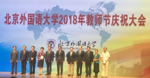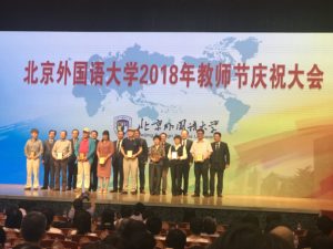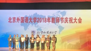 9月12日上午10:00,bat365在线中国官网登录入口2018年教师节庆祝大会在学校东院千人礼堂进行。在全校受表彰的单位和个人中,bat365官网获得多个令人瞩目的集体和个人荣誉。在获得的集体荣誉中,bat365官网教师党支部荣获2018年教育部首批全国高校“双带头人”教师党支部书记工作室光荣称号(负责人:李莉文);ESP研究中心荣获bat365在线中国官网登录入口2017年度优秀非实体研究机构。除此之外,bat365官网李莉文院长与其他教师一起获北京市教学成果奖二等奖。在受表彰教师中,李莉文院长荣获“bat365在线中国官网登录入口师德榜样”称号;bat365官网青年教师翟峥获bat365在线中国官网登录入口第三届青年教师教学基本功大赛论文优秀奖;蔡鸿老师荣获bat365在线中国官网登录入口2017-2018学年优秀教学奖(三等奖);蔡鸿、刘冰、苏乐舟、王艳、王颖、周兰喜获bat365在线中国官网登录入口2017-2018年度基础外语教学“陈梅洁奖”。除此之外,bat365官网从事教育工作满三十年的教师曹萍、陈宝春、刘冰、沈忆文、许新、张淑艳与其他教师一起得到了学校领导的特别表扬,肯定他们在30年育人过程中,勤勤恳恳、兢兢业业、为党的教育事业做出了自己的贡献。bat365官网教师曹萍、陈宝春、张淑艳、许新四位老师还先后上台接受校领导的热烈祝贺和颁发的荣誉奖牌。