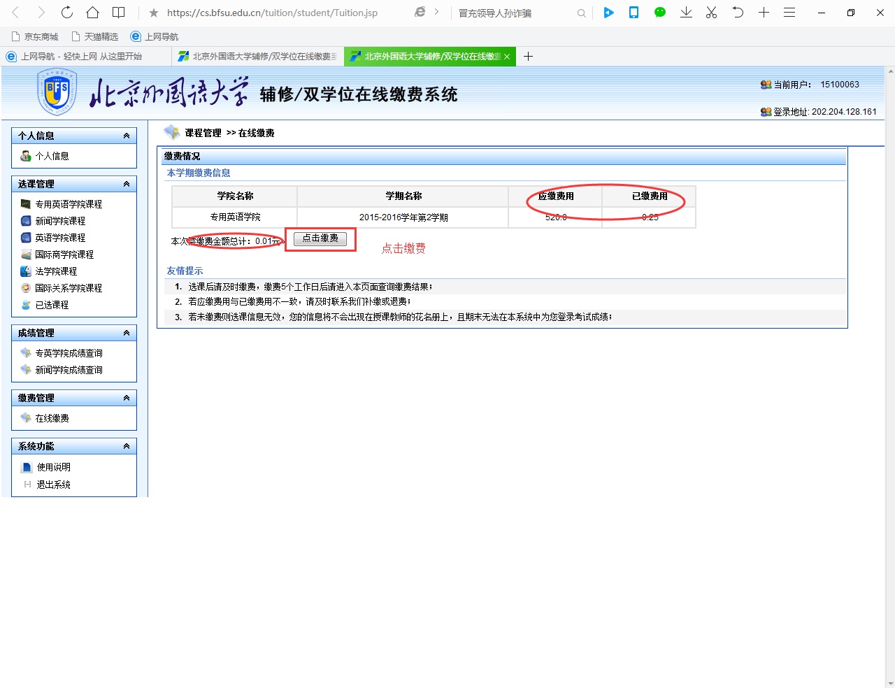 特别提示:各院系英语二外辅修(5-8级)课程,全部使用网上银行交费,请同学们务必配合学校工作安排,及时在网上交费。未交费的同学将被清除名单,不得继续辅修课程的学习。