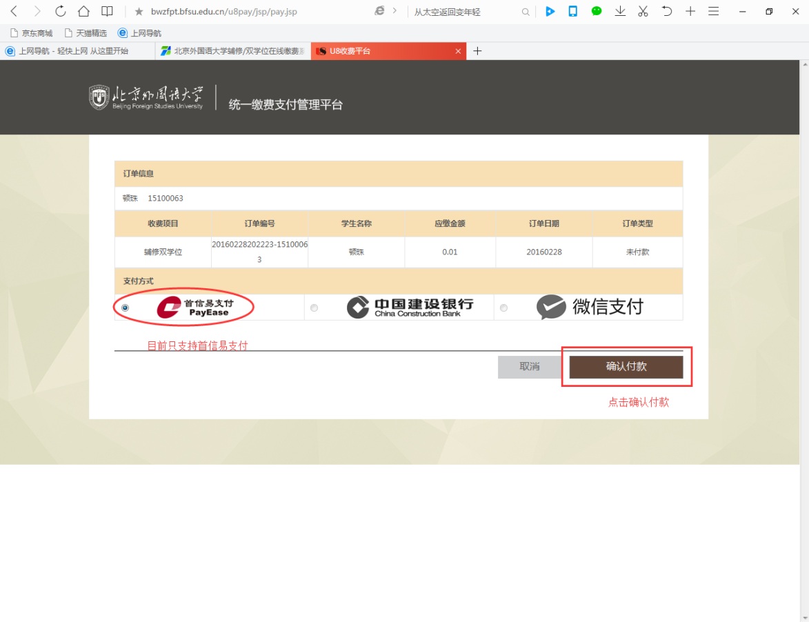 目前只支持首信易支付,点击“确认付款”后,进入首信易支付界面: