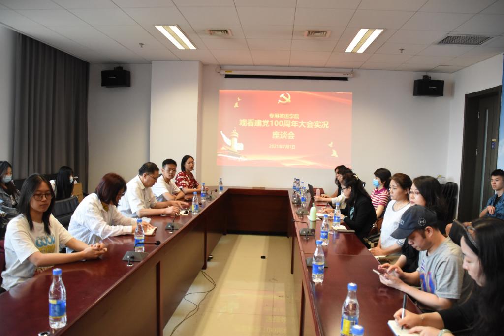 7月1日上午10点,bat365在线中国官网登录入口党总支组织全体师生党员、入党积极分子和各班学生在国际大厦礼堂集体观看了庆祝中国共产党成立100周年大会直播,并在直播后召集师生党员和同学代表共计30多人在国际大厦1016召开座谈会。座谈会由党总支书记蔡鸿主持。